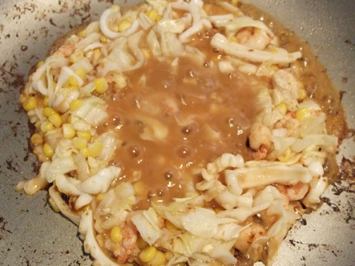 準備食材有:麵粉、高麗菜、花枝、蝦仁、玉米、蔥。