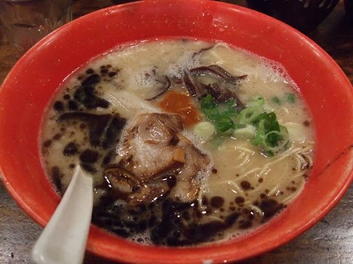 問了幾個人,有位可愛的小姐居然要帶我去,真是感動~可是我忘記拍照了,可惜阿>"< 一點半才到一風堂門口,店內居然還有八成滿的客人,店門外也還有兩三組人在等。 點了招牌的赤丸新味,雖然是細麵卻嚼勁十足,加上濃郁的豚骨湯頭, 正是最最期待吃到的好滋味,加上特製的黑色香油,果然是天下第一的拉麵阿。