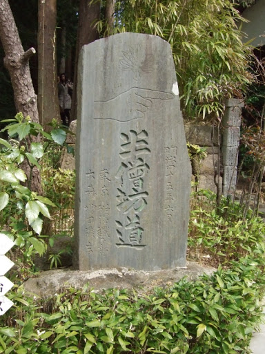 除了歷史悠久的木造建築和庭院的花花草草之外,還有一座空手道大師船越義珍的題字石碑: